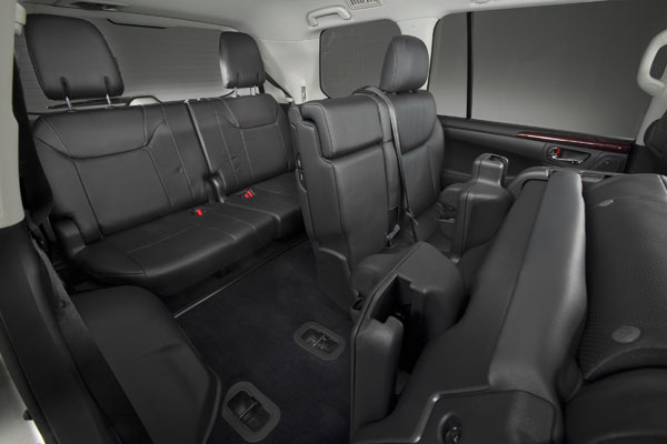 車側部分,鍍鉻窗框往後延伸並融入L-finesse概念的新式設計,搭配新增車身側護板附鍍鉻飾條,更讓車側造型耳目一新。後視鏡新增LED方向燈設計,安全性更加提升。後視造型上, 也融入L-finesse概念設計的LED尾燈組,採用多達27顆的高亮度LED燈,讓LX570行駛於夜間時,成為眾人眼光注目之焦點。而新式後保險桿除增加鍍鉻飾條外,更向後延伸,呈現更具有3D立體視覺效果。