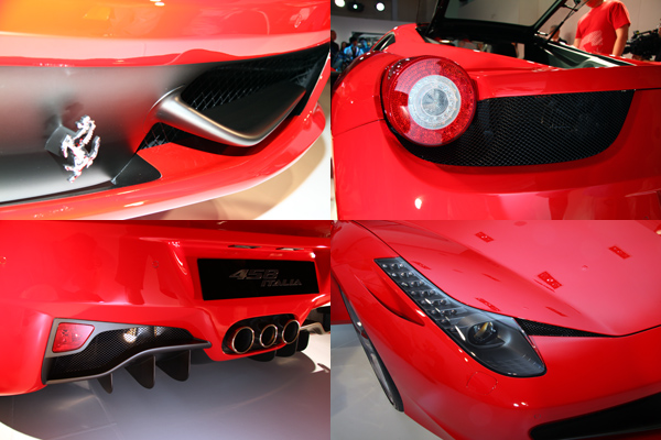 每一輛 Ferrari 都是毫不妥協、融合造型和空氣動力設計的結果。車頭部份,458 Italia 採前水箱罩和兩側進氣道共用同一開口的設計,並具有極為流線的空氣動力外型和線條設計,可將氣流直接導入用來冷卻水箱的全新平整式車底。車頭部份另配置小型氣動彈性效應風翼,可產生下壓力,並隨著速度改變形狀,以降低散熱水箱進氣道截面積和阻力。