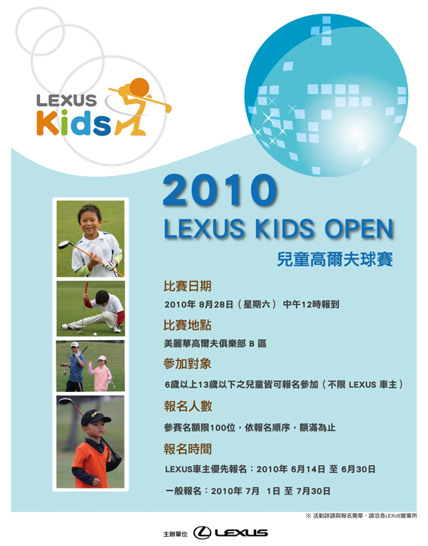 自今年7月份率業界之先舉辦「2010 Lexus暑期兒童高爾夫體驗營」兒童高爾夫活動後,Lexus為讓首度接觸高爾夫學童增加學習樂趣,並提供技術較為純熟的孩子挑戰國際兒童比賽經驗,Lexus將於8月28日在林口美麗華高爾夫俱樂部舉辦第一屆「Lexus KIDS OPEN兒童高爾夫球賽」。