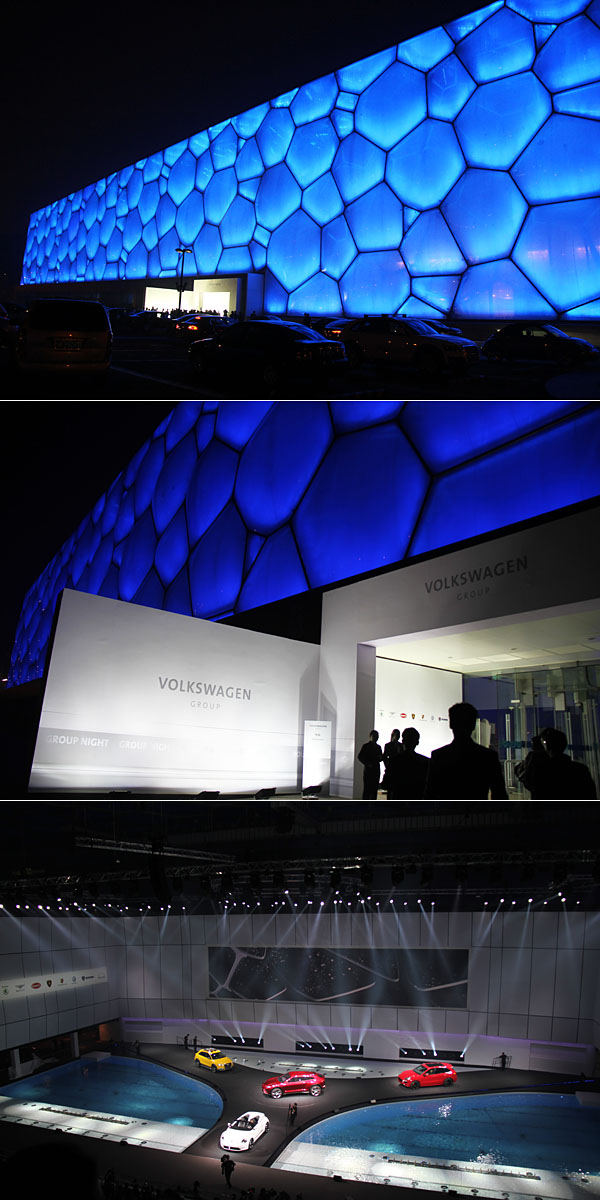 佔地八萬平方公尺、外觀以獨特的膜結構呈現猶如裝滿水的立方體,作為2008年北京奧運的中國國家游泳中心,於2012年4月22月晚上,選擇於2012北京車展開展前夕,褪去了原先濃厚的運動味,換上了一身科技勁裝,因為每次國際車展前皆備受矚目的VW Group Night福斯集團之夜,就在此水立方盛大舉辦!