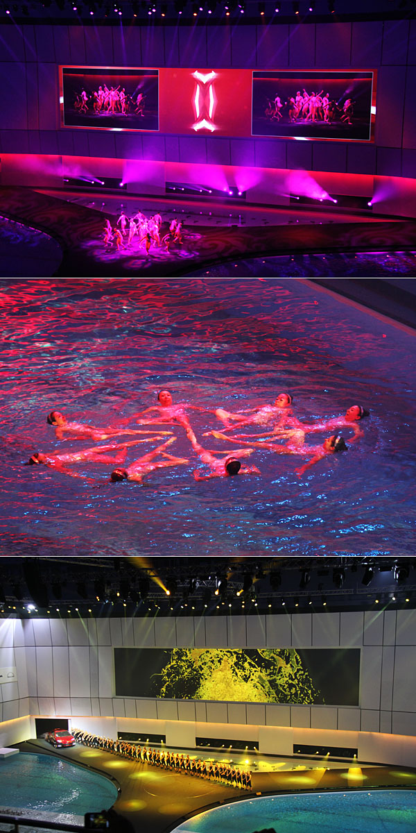 依照慣例,VW集團之夜選擇在北京車展之前,先行對全球與會媒體發表將於隔日展出的重點新車,今年也不例外,選擇了旗下八個品牌、每個品牌一款重點車型依序出場的演出方式,搭配水立方內部水陸合一的場地特色,舉辦了令人印象深刻的發表活動;以VW、Audi、Skoda、Bentley、Porsche、Seat、Bugatti與Lamborghini等出場順序,搭配簡潔有力的串場演出,一一為全球媒體揭開本屆車展VW集團的展出精彩菜單。