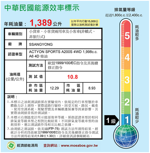 依據能源局相關規定, SsangYong汽車已完成全車系的車輛能源耗用測試,並獲得優異的能源效率等級表現。其中表現最傑出的,為跨界三棲用車首選Actyon Sports,與全方位實行家New KYRON 2.0 Actyon Sports採XDi 200柴油引擎與VGT可變幾何渦輪增壓技術,搭配新一代E-Tronic六速手自排變速系統,成就Actyon Sports極為優異的加速反應與燃油經濟性,更可透過Part-Time四輪傳動模式,行駛在各種濕滑崎嶇路面;根據規定,Actyon Sports以「小貨車、小客貨兩用車及小客車〈非轎式、非旅行式〉」車輛類別、採「歐盟1999/100/EC指令及其後續修正指令」進行測試,獲得2WD車型10.9km/L、4WD車型10.8 km/L的平均油耗測試值,並在「超過1800至2400c.c.」排氣量等級的能源效率等級中,獲得優異的第一級節能表現!