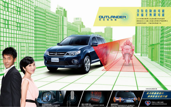 Mitsubushi Outlander優異的產品表現及全方位的安全防護,讓一向愛家的李李仁、陶晶瑩愛不釋手,自從家中多了「她」之後,不僅全家開心出遊的頻率明顯大增,更讓家人感情更緊密的聯繫在一起,充分展現了「用最愛照顧最愛」的品牌主張!而Outlander 電視廣告「白馬王子篇」的創意表現亦獲得台灣最重要的廣告專業雜誌-「動腦Brain雜誌」的青睞,獲選為「2011台灣年度十大創意廣告」,也是唯一獲獎的汽車廠商!