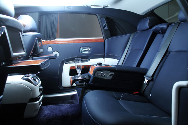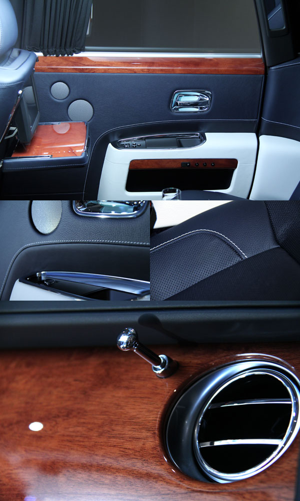 在座艙中則是以Navy Blue and Seashell深藍色為基調,搭配海貝殼色局部內裝與Mahogany紅木飾板,同時在頭枕RR Logo刺繡上選擇了深藍色縫線,並且選擇了後座獨立式電動座椅、後座按摩座椅、真皮車式天篷〈局部〉、獨立式後座電動椅、後座影音劇院系統 (含6片裝DVD換片匣)、行動數位電視、後座冰箱、後座區域私密隔簾等配備,完整地體現「Six Senses」全感官理念。
