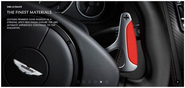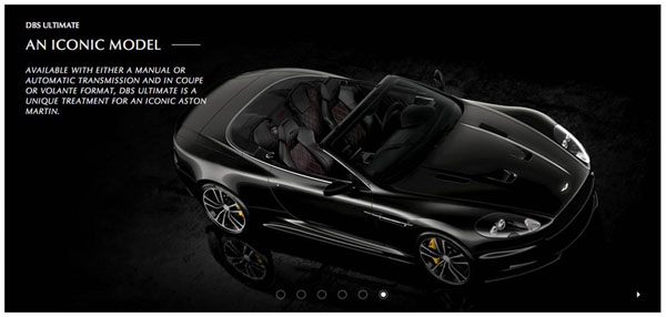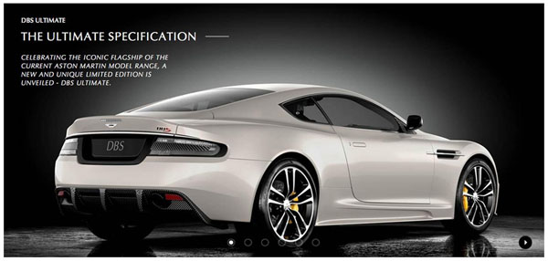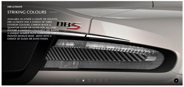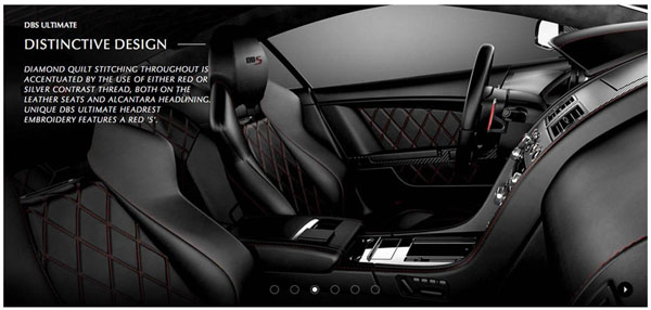 就在無預警的情況下,Aston Martin 在官網中公佈了即將推出DBS終極版本的訊息與首批照片,不過卻尚未發布正式地新聞稿與完整廠照;在Aston Martin官網所發布的訊息中,DBS終極版將有石墨黑與鈦瓷銀兩種車色可選擇,車尾地DBS銘牌中的〝S〞也將改為紅色字樣,搭配燻黑尾燈、黑銀雙采鋁圈等專屬部品,煞車卡鉗也有紅、黃、黑三種烤漆顏色可選擇,同時還將有專屬的銘牌彰顯身分。
