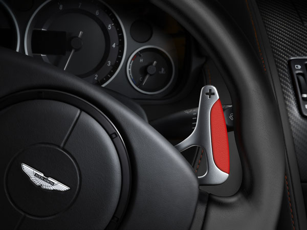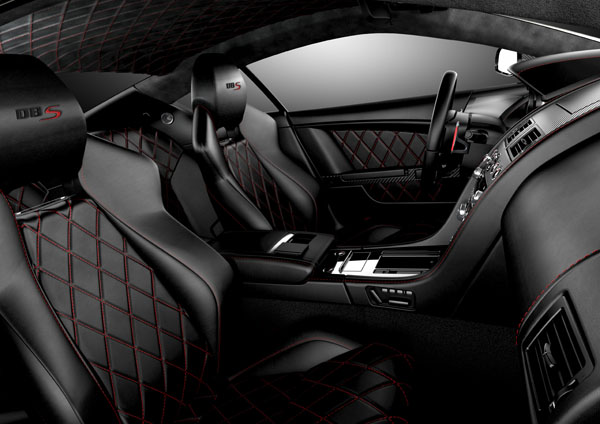 車內部分以黑色為基調,除了車頂篷採用Alcantara類麂皮材質外,車內幾乎都是用真皮包覆搭配上紅色縫線,並且在座椅、門飾板與車頂都使用鑽石格紋縫飾,方向盤換檔撥桿上的真皮包覆部分改用紅色皮革包覆,展現英國獨有的典雅氣息。另外,座椅頭枕上繡的DBS字樣,〝S〞也將同樣改以紅色縫製。