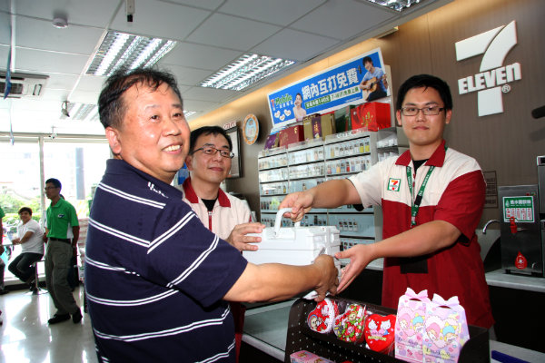 澎湖7-11提供免費提供電池交換服務 中華汽車總經理劉興臺與7-11行銷群服務商品部王炳蘊部長輕鬆完成電池交換。
