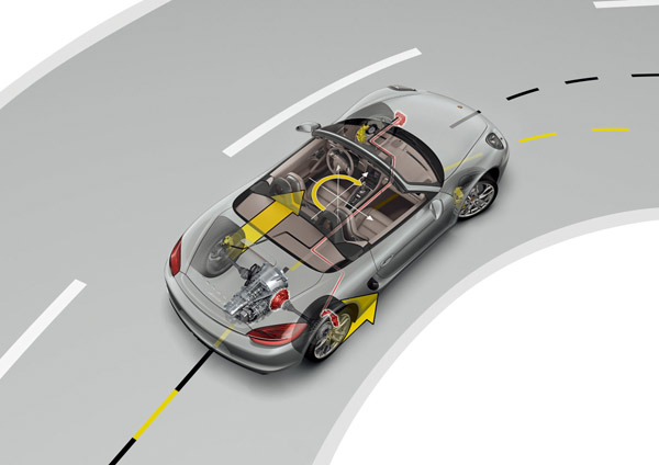 此外,最新一代 Boxster 除了大幅降低的車重,並以更長的軸距、更寬的輪距以及加大胎圈配置等,進一步提升這部在同級距中置引擎車款中,早已表現超群的駕馭動態,而全新的電動機械動力輔助轉向系統則更使其如虎添翼。全新 Boxster 軸距加長 60 mm,前輪距與後輪距分別加寬 40 mm與18mm,可使胎圈組與車身流暢對齊。同時,為了進一步強化其駕馭動態,Porsche提供跑車計時套件作為 Boxster 的額外選用配備之一,並將主動式變速支撐系統首度納入此車型,同樣首見於 Boxster 的配備,還有包含機械式後軸差速器鎖定的Porsche扭力分導系統(PTV)。