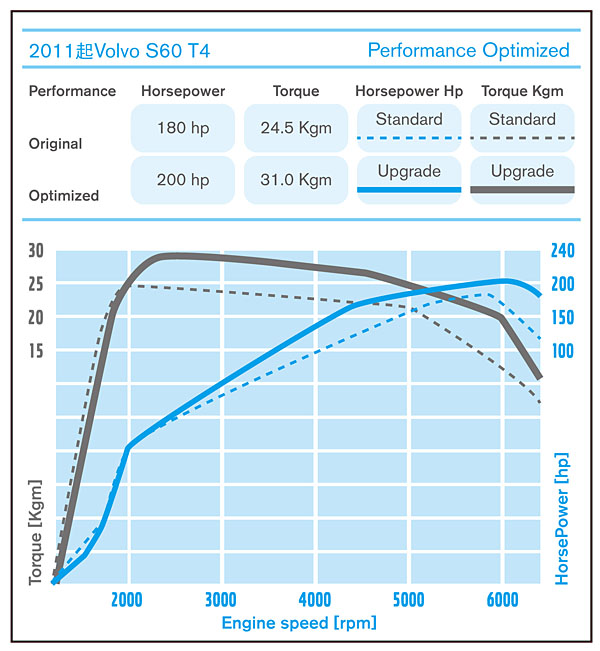 針對S60 T4所搭載的1.6升四缸渦輪增壓汽油引擎,經SAM Power重新調校供油模式,最大馬力可由原廠的180hp/5700rpm提升至200hp/6000rpm,峰值扭力則可由24.5kgm/1600-5000rpm進步到31.0kgm/2100-2500rpm。