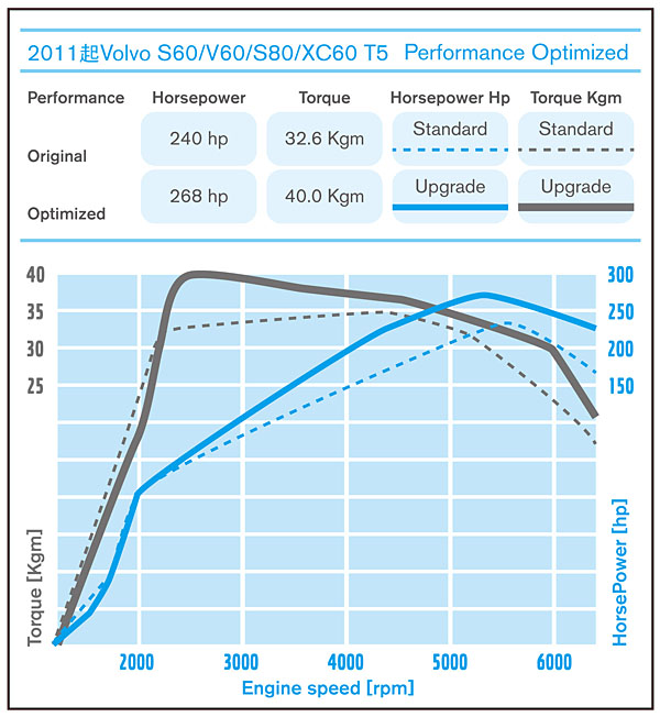 除了S60 T4車型之外,SAM Power也同樣針對S60 T5車型推出對應之改裝套件,安裝後可讓最大馬力從原廠的240hp/5500rpm進步至268hp/5520rpm,峰值扭力也可從32.6kgm/1800-5000rpm提升到40.0kgm/2500-3000rpm,進步幅度也約莫為一成以上,連工帶料價格為新台幣48,332元。以S60 T4的體驗經驗,S60 T5的SAM Power改裝套件,其實也相當推薦對於動力需求較多的車主朋友。