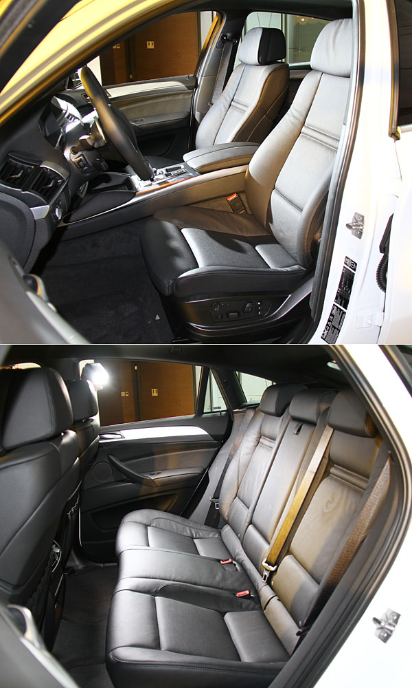 車室內裝承襲先前格局,僅針對X6 xDrive35i車型提升配備水平,將原有的雙前座電動調整座椅升級為雙前座跑車電動調整座椅含駕駛座記憶裝置,並針對音源輸入多元性提升,導入如USB音源插槽與藍芽免持行動電話系統;X6 xDrive40d則維持原有配備。