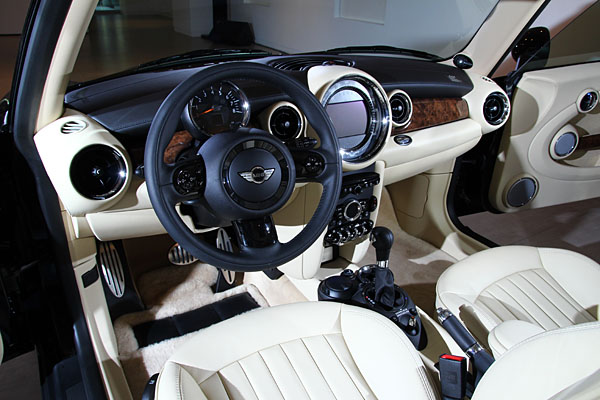 鋁質迎賓門檻同樣鑲有〝Inspired by Goodwood〞,座艙整體以溫暖柔和的玉米穗色系設計,內裝採用專屬的Cornsilk Beige小牛皮真皮,搭配Cashmere喀什米爾頂篷與Lambswool小羔羊毛地毯,而Mini經典圓形時速表則以黑色底色設計,創新採用與Rolls-Royce儀表相同的專屬字型;Mini Inspired by Goodwood限量版〝1 OF 1000〞徽飾鑲於中控台下方,搭配Rolls-Royce於Goodwood工廠為Mini特別訂製的Walnut Burr胡桃木木紋飾板,在一片玉米穗色中點綴出視覺層次美感。