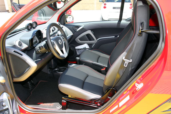 擁有高安全性的tridion車體結構一直是smart車系在外型最受注目的特色之一。在外觀上,smart edition sharpred的tridion選用熱情的紅色作為配色,和紅色後照鏡護罩相互呼應,加上車體主要的黑色配色及燻黑合金鋁圈,激盪出個性鮮明強烈的外觀設計。內裝部分除了搭配了紅色車縫線的高質感全皮革包覆內裝外,還附有特仕版專屬腳踏墊,延續edition sharpred的獨特個性至車內。