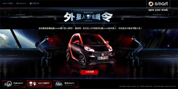 配合2013年式smart fortwo全新改款車型上市,特準備了最具創意的網路行銷活動。地球上最高智慧結晶 smart 遭外星人竊取!據線報,你的友人可能就是私藏 smart 的外星人,快從朋友中揪出可疑人物吧!詳情請上活動網站: http://www.smartcar.com.tw/events/are_you_smart/