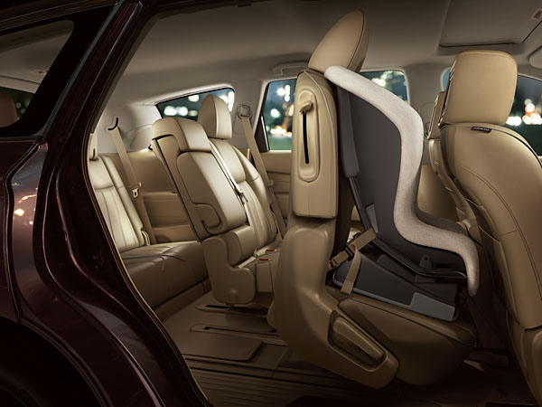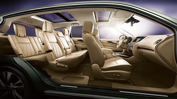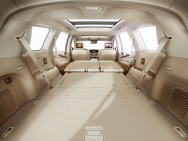 行李箱空間上,七人座滿載時JX仍擁有447公升,在五人座時更擁有達1277公升的充裕置物空間,若有裝載大型物品的需求,INFINITI JX也能輕鬆將第二、三排座椅傾倒,提供達2166公升的寬闊行李廂空間。