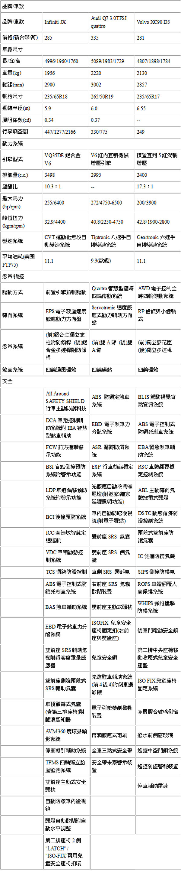 有鑑於此市場反應,Carstuff人車事也特別針對Infiniti JX與兩主要對手Audi Q7與Volvo XC90進行主要規格與安全配備的比較,讓消費者在選購前可有著更充足的了解。此次比較的三款車型,除了XC90由於產品時間較長,僅存D5車型外,JX選擇頂級的旗艦款,而Q7則以動力規格與價格帶較接近的3.0TFSI作為比較對象。