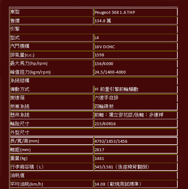 Peugeot 508 1.6 THP五視圖與基本規格表