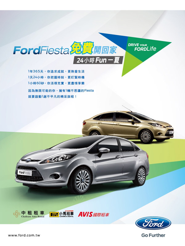 此外,為讓消費者對Ford車款有更深的體驗,福特六和推出「Ford Fiesta免費開回家」深度試駕活動,消費者只需至Ford展示中心填寫資料並索取試車券,便可至全省中租租車、小馬租車或是AVIS國際租車取得Ford Fiesta四門時尚版的一日使用權;在深度試駕24小時後,再將個人試駕經驗撰寫文章並分享至各大論壇或社群網站,還可以參加不思議小旅撰文比賽,月冠軍還有機會獲得Rimowa旅行箱或等值萬元獎品。