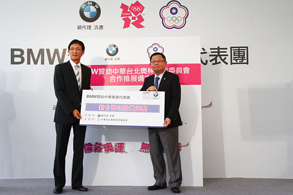 BMW總代理汎德公司杜黃旭總裁(左)中華奧林匹克委員會蔡辰威主席(右)正式啟動簽約儀式,並贊助50萬元現金予中華奧委會。