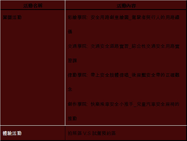 秉持著關懷兒童交通安全,與致力將交通安全觀念落實全台的理念,BMW 台灣總代理汎德公司與全台經銷商自2008年開始便舉辦「BMW兒童交通安全體驗營」,結合趣味遊戲與教育意義,深受家長與孩童的廣大迴響。為了將兒童交通觀念更加拓展到全台灣,今年於各經銷商舉辦之「2012 BMW兒童交通安全體驗營」,以「安全之悅,幸福無界」為主題,並以「學院」作為活動概念,透過「作中學、學中作」的方式,讓孩子在體驗有趣的交通安全闖關遊戲以及獲得闖關贈品同時,有效地吸收正確的交通觀念知識,達到寓教於樂的意義。