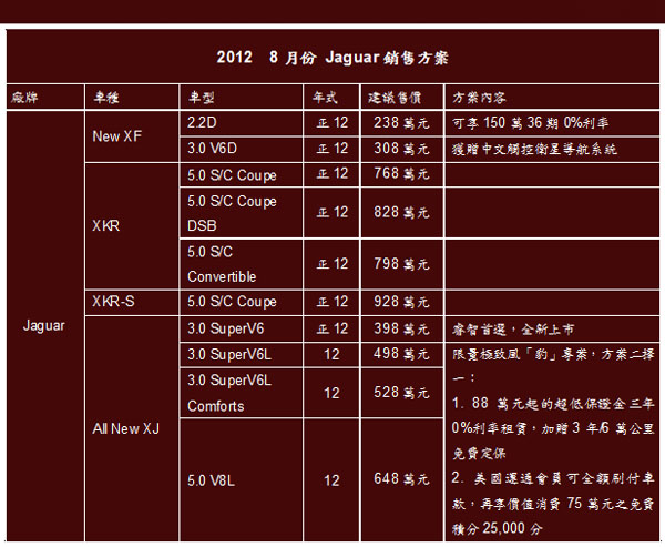 Jaguar台灣總代理九和汽車慶祝國內銷售佳績,針對旗下兩款熱門車型─New XF和All New XJL推出兩款優惠專案,回饋給國內品味不凡的層峰人士!八月份針對入主正12年式New XF 2.2D推出150萬元36期0%利率方案,而New XF 3.0 V6D則加贈原廠中文觸控式衛星導航系統,禮遇每一位眼光獨具的車主;而Jaguar台灣總代理九和汽車更與萬和租賃和美國運通卡攜手合作,針對12年式All New XJ長軸車款推出限量最後26席的「絕無僅有‧極致風豹」尊榮租賃專案,或美國運通卡會員全額刷卡尊榮入主專案。