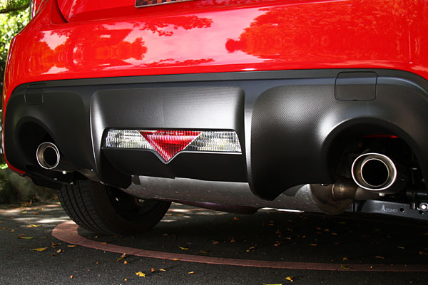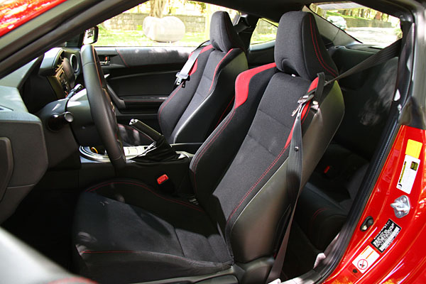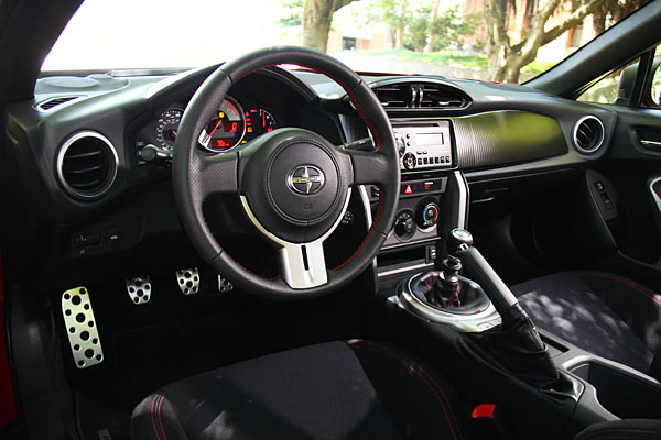 此次所試駕的FR-S,是由益新國際所引進的首輛車型,紅色的外觀,除了加選後保桿的車名貼紙外,其餘皆為原廠式樣,外觀上與86車型大抵相同,但並沒有更添運動氣息的外觀空力套件,也沒有HID頭燈與霧燈組,僅採取魚眼頭燈式樣;內裝部分以黑色搭配紅色縫線,音響系統為Pinoeer品牌配置的標準規格,空調為傳統旋鈕控制而非雙區恆溫,搭配上八支揚聲器,規格也不顯陽春。