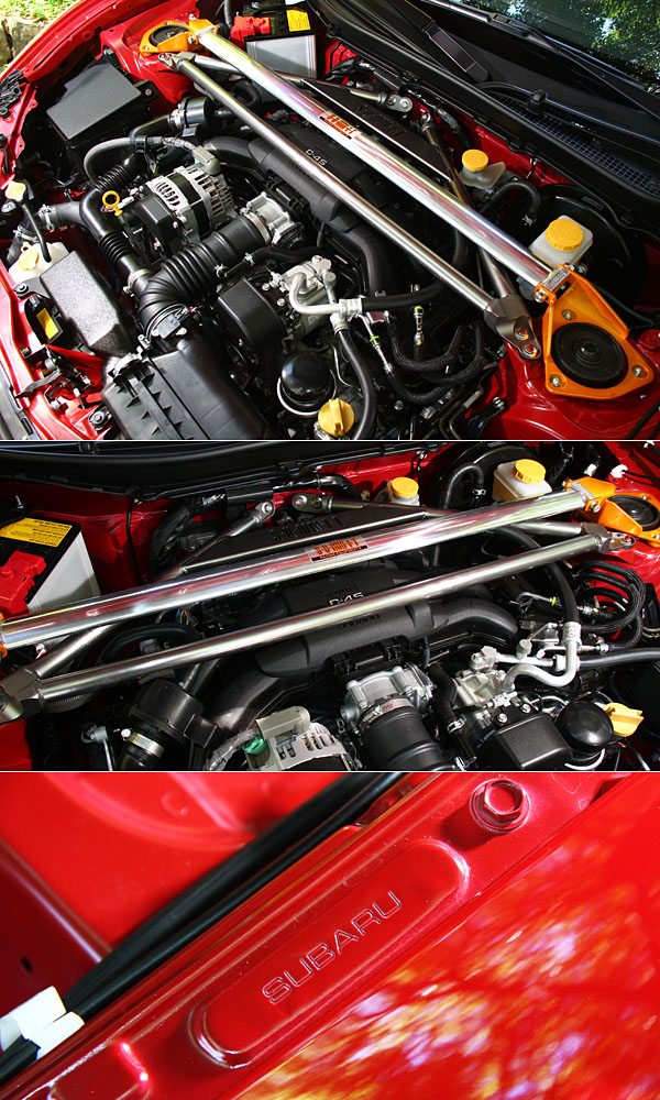 動力系統同樣搭載世界首具D-4S缸內直噴水平對臥引擎,可輸出200hp/7000rpm最大馬力,峰值扭力則為20.9kgm/6600rpm;此輛FR-S已安裝SUMMIT引擎室強化拉桿,提升車體剛性;引擎室兩旁鈑件仍具有SUBARU打印字樣,告知生產血緣。