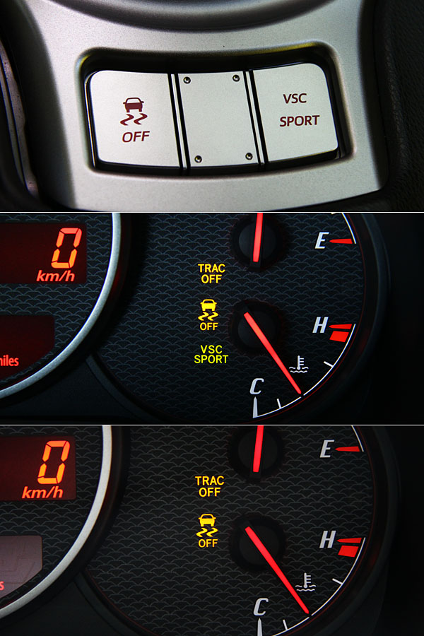 由於為手排車型,因此取消了變速系統雪地與運動模式按鍵,不過仍提供VSC運動模式切換功能與循跡系統開/關功能,如要將循跡系統完全關閉不介入,需將VSC切換至運動模式、循跡系統關閉後,於行駛間再次按下循跡系統關閉鈕長達5秒,VSC SPORT警示燈便會關閉告知。