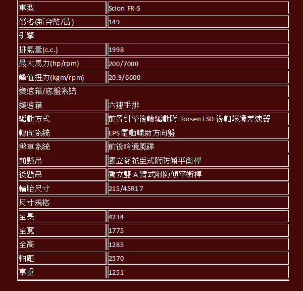 由貿易商益新國際所引進的此輛Scion FR-S,動力源與兄弟車型Toyota 86與Subaru BRZ相同,並採取六速手排設定,報價為新台幣149萬元。