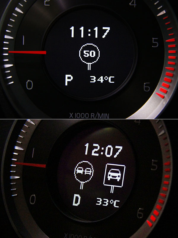 安全面的強化,可說是2013年式V60 D4與V60 D3差異最大的地方,但原有車主也別緊張,不是那種天差地遠的大幅躍進,而是針對細節的再加修改。首先最讓筆者欣賞的,乃是名為RSI路標顯示暨速限警示系統,這系統聰明,可透過ACC主動控制巡航系統的偵測裝置,來捕捉道路上的路標或限速標誌,將限速提醒於儀表內,其他如相關的路標也可以準確的呈現,有效提醒駕駛注意。整日試駕中,判讀性出色,只要經過速限標示,如與上路段有落差,RSI系統會立刻修改速限,呈現於儀表上。