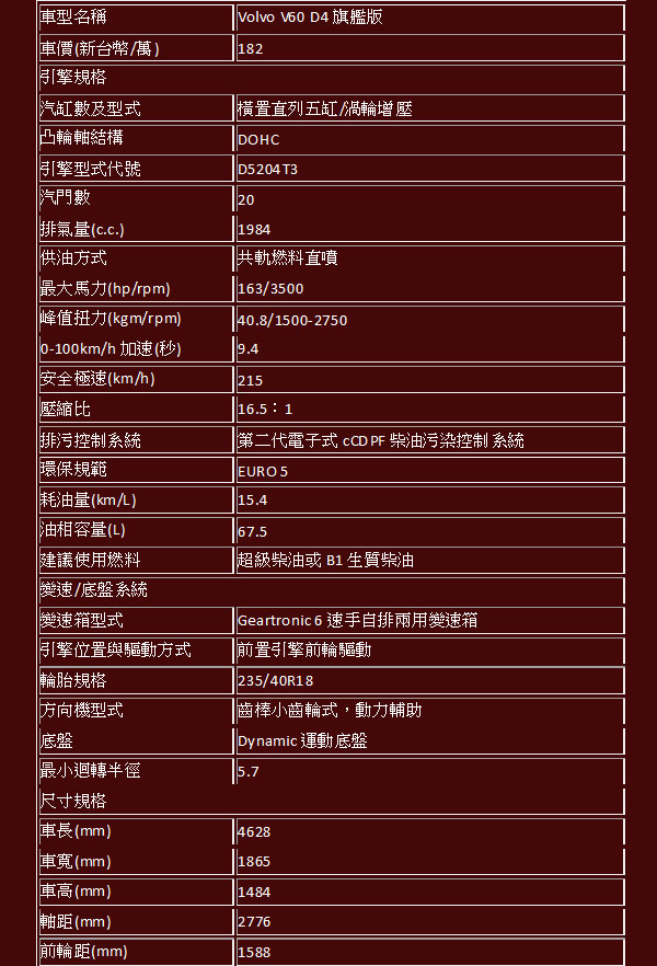 Volvo V60 D4基本規格表