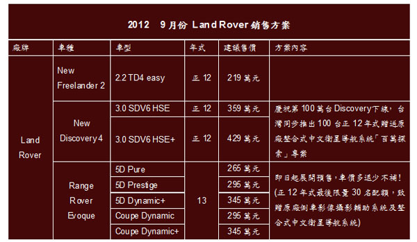 而歡慶Range Rover Evoque上市後在台灣銷售的熱潮,Land Rover台灣總代理九和汽車也針對正12年式車款,提供最後30名Range Rover Evoque車主加贈原廠倒車影像攝影輔助系統及整合式中文衛星導航系統的專屬尊榮禮遇,配額有限,稍縱即逝!