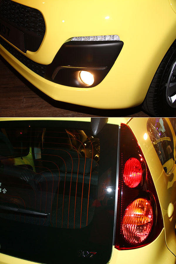 全新小改款107車頭造型結合全新企業識別金屬立體獅徽與引擎蓋造型,搭配高穿透性前霧燈與標配LED日間行車燈,前保桿的進氣壩造型也改為懸浮式設計;車尾部分除了同樣的全新金屬立體獅徽與107字樣外,尾門兩側燻黑尾燈組也為全新設計。