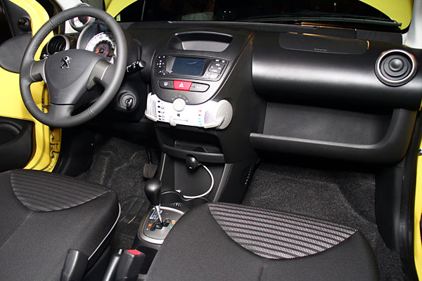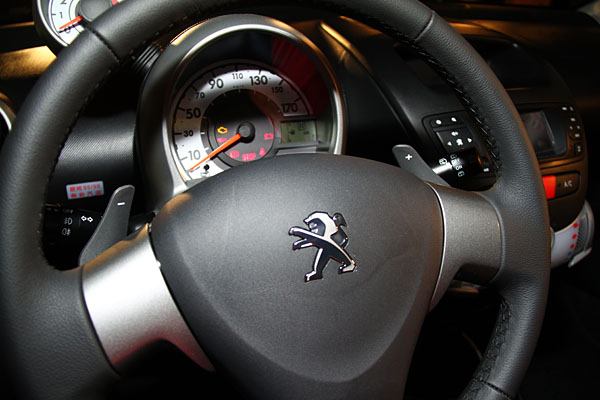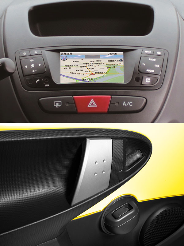 車室內裝部份,導入全新造型之真皮包覆方向盤,輔以類金屬點綴,結合F1方向盤換檔撥桿;影音娛樂方面,全新小改款107除支援CD/MP3/WMA/USB/i-Pod/AUX-IN前置式外接音源輸入端子外,更可完整支援i-Phone音源輸入;另外,為提供車主多元化娛樂需求,全新小改款107可選配NAVIPACK多媒體影音系統,以4.3吋觸控螢幕整合GPS衛星導航系統、免持藍芽通話、DTV數位電視及倒車顯影等功能,加上前座新增加的雙揚聲器,音場表現更優異。