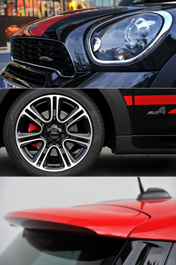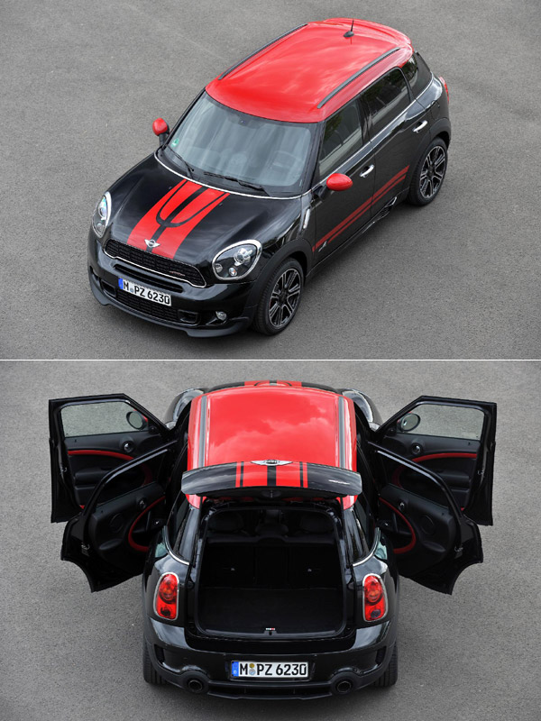 MINI John Cooper Works Countryman綜合了賽車傳動科技、全時四輪驅動、高級車的外觀、與多功能內裝,它獨特的造型,藉由車頭以多樣的設計,以及專屬的塗裝、輕合金鋁圈、與各式內裝素材所構成。John Cooper Works家族的第六名成員,標準配備包括全車的空力套件,除了讓前後保桿更具肌肉感,另外還有專屬的側裙、18吋輕合金鋁圈、以及跑車化的車室氛圍等,這些都讓它成為一部特殊的John Cooper Works車款。