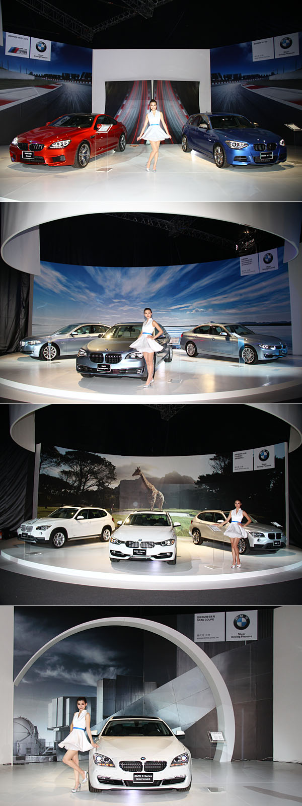 位於角落的四大展區各別展出ActiveHybrid 7/ActiveHybrid 3/ActiveHybrid 5、3系列Touring/X1、M6/M135i與6 Gran Coupe。
