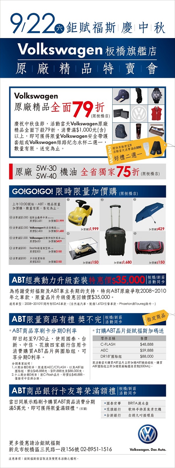 9月22日, 位於新北市板橋的鉅賦福斯旗艦店, 展開了為時一天的生活精品特賣會與多樣ABT改裝促銷活動。 其中最吸引人的, 要算是首創的七五折機油券, 一次以一箱為一組, 希望車友提前購買的機油優惠券, 可以以便利的方式在保養的時候使用!