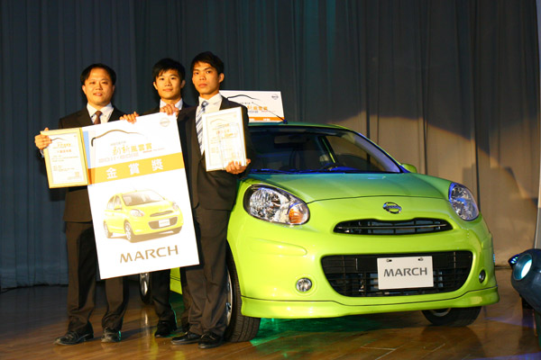 第六屆裕隆日產創新風雲賞金賞獎得主「風起雲湧」隊與他們的獎品─Nissan New March一同合影。