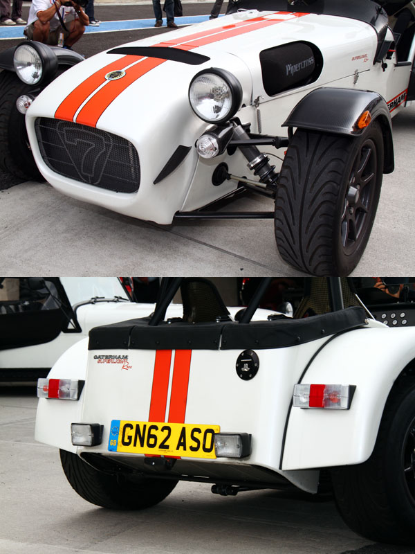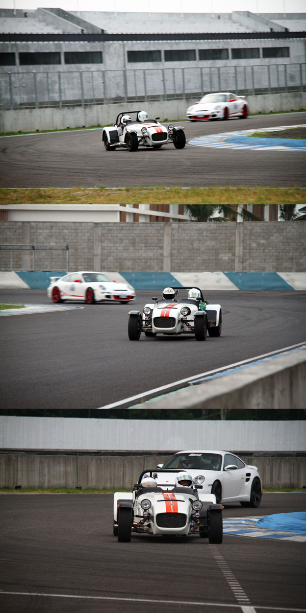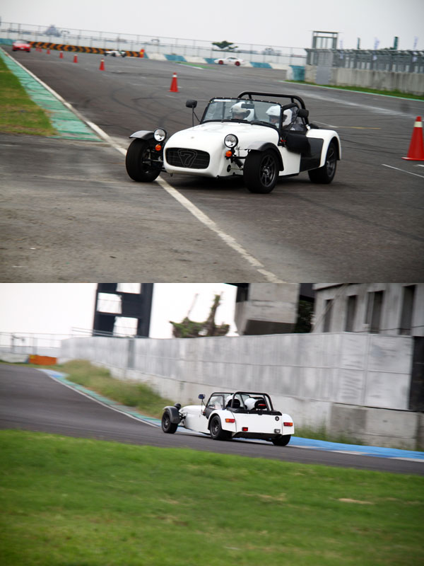首先在Superlight R500試乘體驗部分,全新引進的Superlight R500為Caterham目前性能最強悍的市售車之一,在極致輕量化下,空車重僅506kg,搭載2.0升Caterham Motorsport Duratec引擎,可輸出263hp最大馬力與24.4kgm,可創造驚人的1.92kg/hp超低重量馬力比,當今市售超跑中,也鮮少能壓至2kg/hp以內,僅有身價上億的Bugatti Veyron達1.89kg/hp水準,搭配六速手排變速系統〈可選配序列式變速系統〉,0-100km/h起步加速只需驚人的2.88秒。也因為性能十分強悍,以及基於安全理由,Superlight R500未提供試駕,僅由教練Alan Parkes駕駛載著參與活動的媒體進行體驗,同時為了讓媒體朋友感受Superlight R500與其他跑車的差異之處,歐馬汽車還特地安排由另一位教練Dave Price駕駛Porsche 911 Turbo〈後改為911 GT3〉做為對照組。在體驗過程中,可以感覺到Superlight R500全力衝刺的速度感明顯較一般跑車明顯許多,除了本身的加速性能,無檔風玻璃與低底盤設計,讓車內乘客直接迎風,路感也更為明顯,整體速度感有加倍的效果,因此,坐在車內所感受到的速度會比想像中快,而且過彎極限相當高,只是動力輸出較大,使得在出彎時得更細心控制油門,以防車尾滑出,但即使不是自己駕駛,還是可以感受到Superlight R500的可駕馭性也比預期高,當教練於出彎時刻意加深油門讓車尾滑出後,也只要稍微反打方向盤,油門放輕,整輛車很快就會回到原來的路徑上;全然輕量化的Superlight R500,毫無任何豪華舒適配備,橫向空間更是窄到把人緊包於車內,只會感覺到最原始的機械感,相較於其他跑車,不只是911 turbo,即便是Lotus Elice對Superlight R500來說都像是寬敞的商務艙。