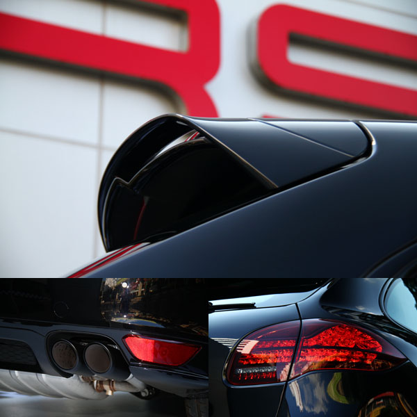 車尾部分特別引人注目的雙翼造型車頂擾流尾翼,增加了後輪軸上的下壓力。最後,尾門上的高亮澤黑色飾條、著色 LED 尾燈以及一對黑色的雙出尾管,更完美無懈地襯托出此車鮮明的運動風格主題。