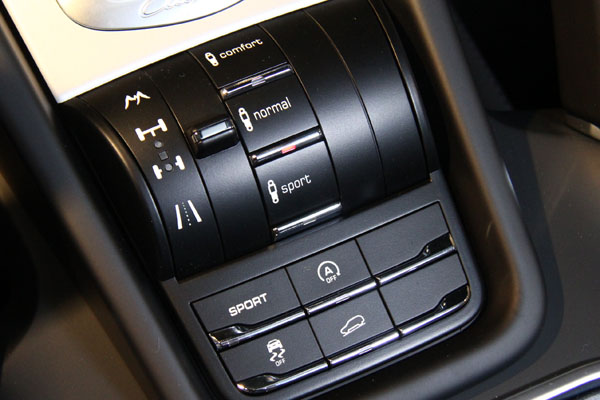 於中央鞍座上配有多組電子輔助系統控制介面,包括有PASM保時捷主動式懸載調整系統、越野控制鍵、PHC斜坡緩降系統、PSM保時捷車身動態穩定系統與引擎待速休止系統等。