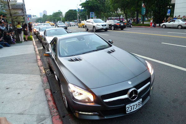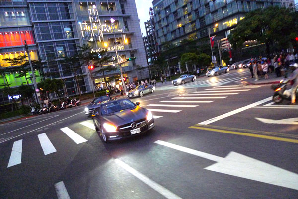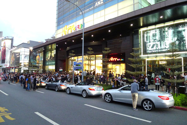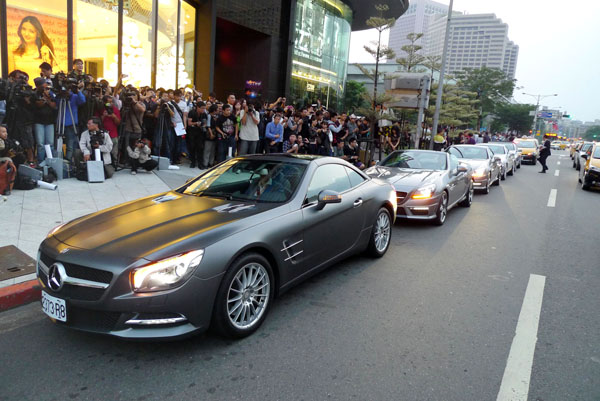 【Mercedes-Benz 道路星勢力】第一站來到台北信義鬧區ATT 4 FUN前,5台以SLK 55 AMG、SLK350、SL350、E350 Cabriolet等車款組成的賓士夢幻車隊一字排開,展現氣勢,同時還邀請人氣男星錦榮出席,成為最大驚喜點。