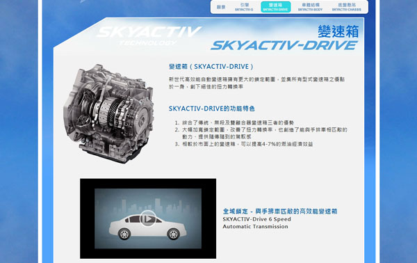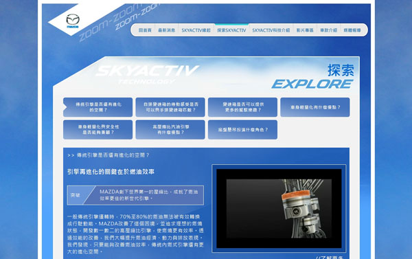 除了從理性層面明白SKYACTIV的技術架構之外,網站中也有許多的文字和影片去著墨SKYACTIV的發展哲學,讓車迷們能夠瞭解MAZDA為何會提出這套獨樹一格的車輛科技新突破。同時網站也蒐羅了各大台灣汽車媒體對於SKYACTIV的實際測試評價,讓消費者明白這套科技實際運用出來的成效。