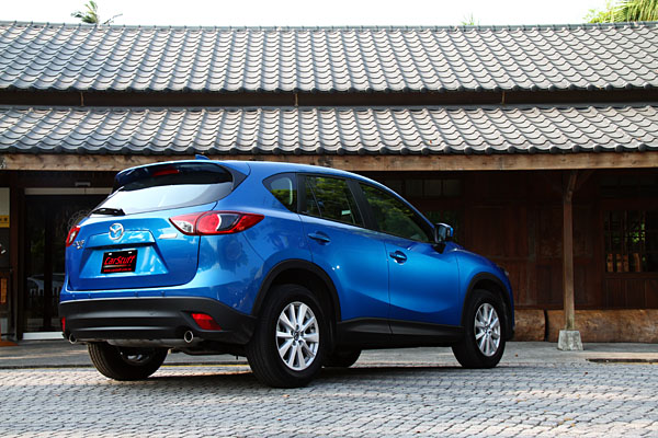 CX-5車頭以上揚的頭燈搭配大面積盾型水箱罩,描繪出Mazda新世代車款的嶄新家族面貌,承襲自MINAGI概念車的碩大輪拱搭配17吋大型鋁圈,與車身下半部灰黑色塑料護版,說明都會與郊區的Crossover本質。獨特的V型車身腰線,與寬厚的C柱向延伸至躍動的車頂線條,展現源自動物奔馳的美感。車頭相呼應的上揚車尾燈,搭配大面積尾翼與車頂魚鰭天線,及下方的外露式左右雙出排氣尾管,展現內斂的性能氣勢。