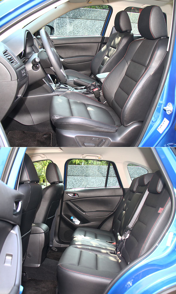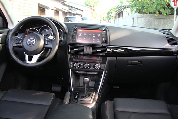 舒適性配備也不馬虎,外觀部分,CX-5配備魂動雙色前後保桿、光感應HID氙氣頭燈(附主動轉向及自動水平調整功能)、日行燈、前後霧燈、雨滴感應雨刷、Keyless感應式門鎖、高剛性17吋鋁圈與225/65R17輪胎、雙開啟式天窗、鯊魚鰭天線、大型尾翼、不鏽鋼雙排氣尾管、全車淡色抗UV玻璃等配備。內裝配備Push Start引擎啟動鈕、定速巡航系統、智慧型行車電腦、MID多功能顯示幕、駕駛座8向電調座椅+電動腰靠、前雙座三段加熱功能、左右獨立恆溫空調、花粉過濾裝置、方向盤音響/定速控制介面、KARAKURI捲軸式行李廂遮板,三組12V電源孔(中控台、前座扶手、後行李廂)、4:2:4 KARAKURI分離可折式後座椅、後座椅背快速傾倒裝置,此外還有整合DVD影音播放、倒車顯影、GPS衛星導航(具備陀螺儀、軌跡記錄等功能)還可接受藍牙、USB、MicroSD、iPod介面影音播放操作,及手機藍牙連接匯流免持功能,可透過中控台的8吋觸控螢幕,直接查詢手機中的電話號碼、通話記錄、撥打電話等功能。