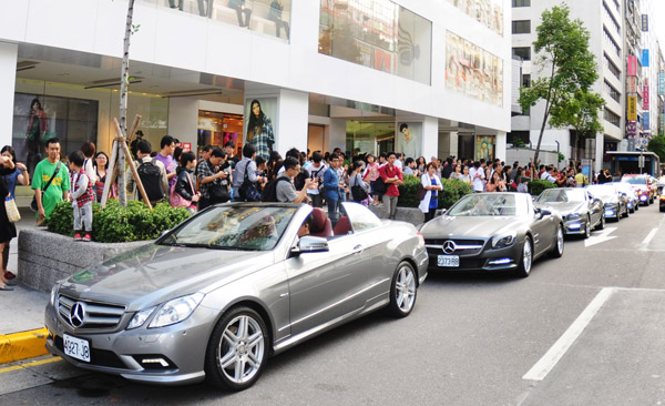 接著11/13週六下午【Mercedes-Benz 道路星勢力】快閃行動則是轉戰台北東區最熱鬧、人潮聚集最密集的忠孝東路四段明曜百貨前。今日由凱渥長腿名模林又立擔任賓士夢幻車隊隊長,穿著既時尚也優雅的黑色皮革小洋裝,彷彿呼應2012年SL全新平面形象廣告中荷蘭超模Lara Stone的冷豔形象,與夢幻車手們短暫快閃現身拍照,旋即又與賓士夢幻車隊一同開篷遊行忠孝東路四段,沿途與街頭民眾們熱烈招呼,再次創造矚目話題。