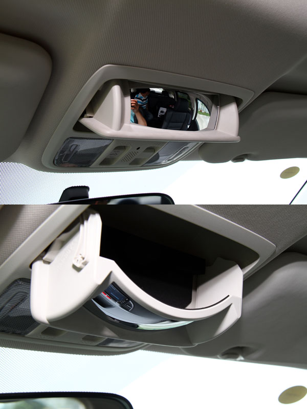 設置於車內後視鏡上緣的眼鏡盒巧妙地與車內視察鏡融合在一起,顯見設計師的巧思,此視察鏡在乘載兒童時用來掌握兒童狀況之用,駕駛可以不會因回頭觀察而造成危險。