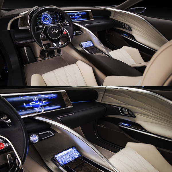 Lexus LF-LC Blue概念車的內裝也十分炫目,中控扶手處還有觸控螢幕鍵盤的設計。