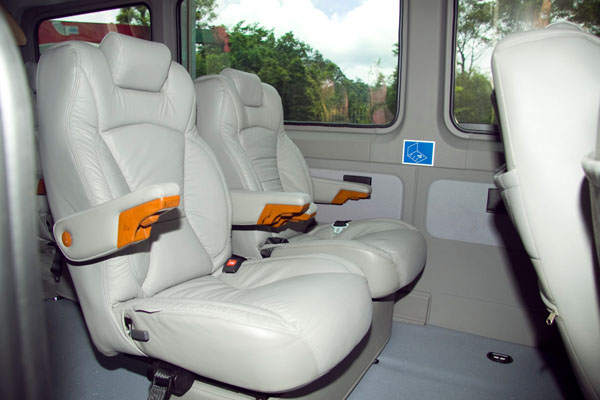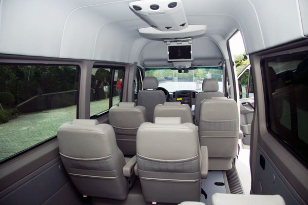 VW Crafter在2010年初的台北車展中以「明星褓母車」之姿態,引起媒體的高度注目並吸引上流階層買家持續下單。而日月行館採用的Crafter是高頂長軸車款,配置六張頭等艙座椅,挑高的車頂大面積的車窗,讓貴賓進入車室後沒有絲毫的壓迫感,整體內裝採用了典雅的米色系,細緻柔軟的皮革座椅搭配原木飾條扶手讓貴賓彷彿進入頭等艙。