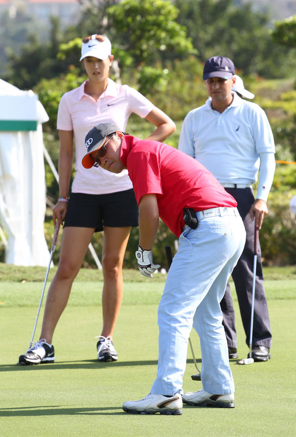 台灣奧迪汽車邱山祥總裁和LPGA女子高球界的漂亮寶貝韓裔美籍魏聖美同組配對比賽,以球會友之餘也和職業選手一樣展現十足專注力。